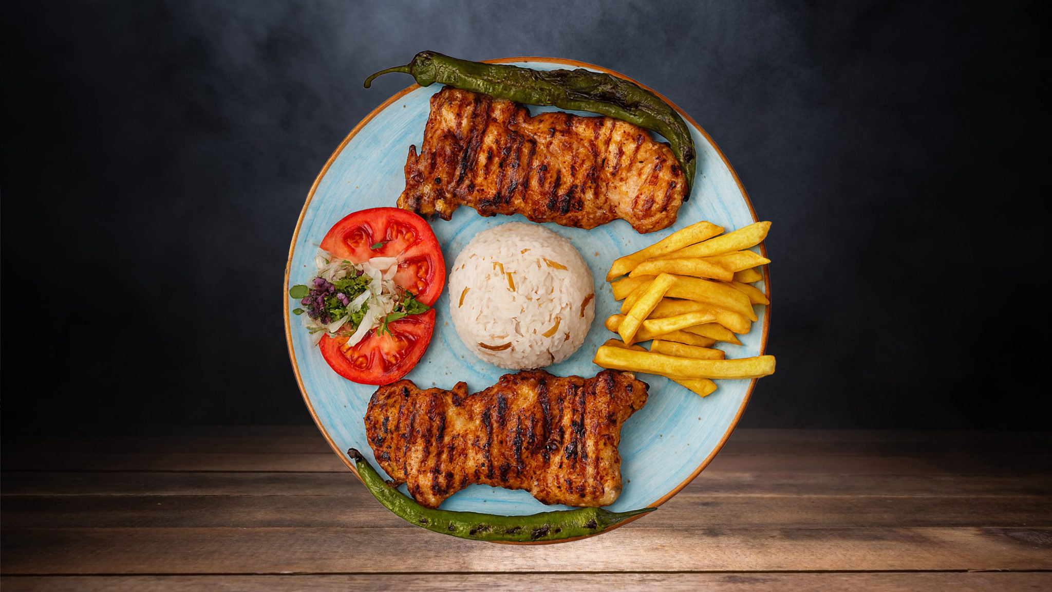 Izgarada pişen tavuk pirzola, patates kızrtması, pilav, salata