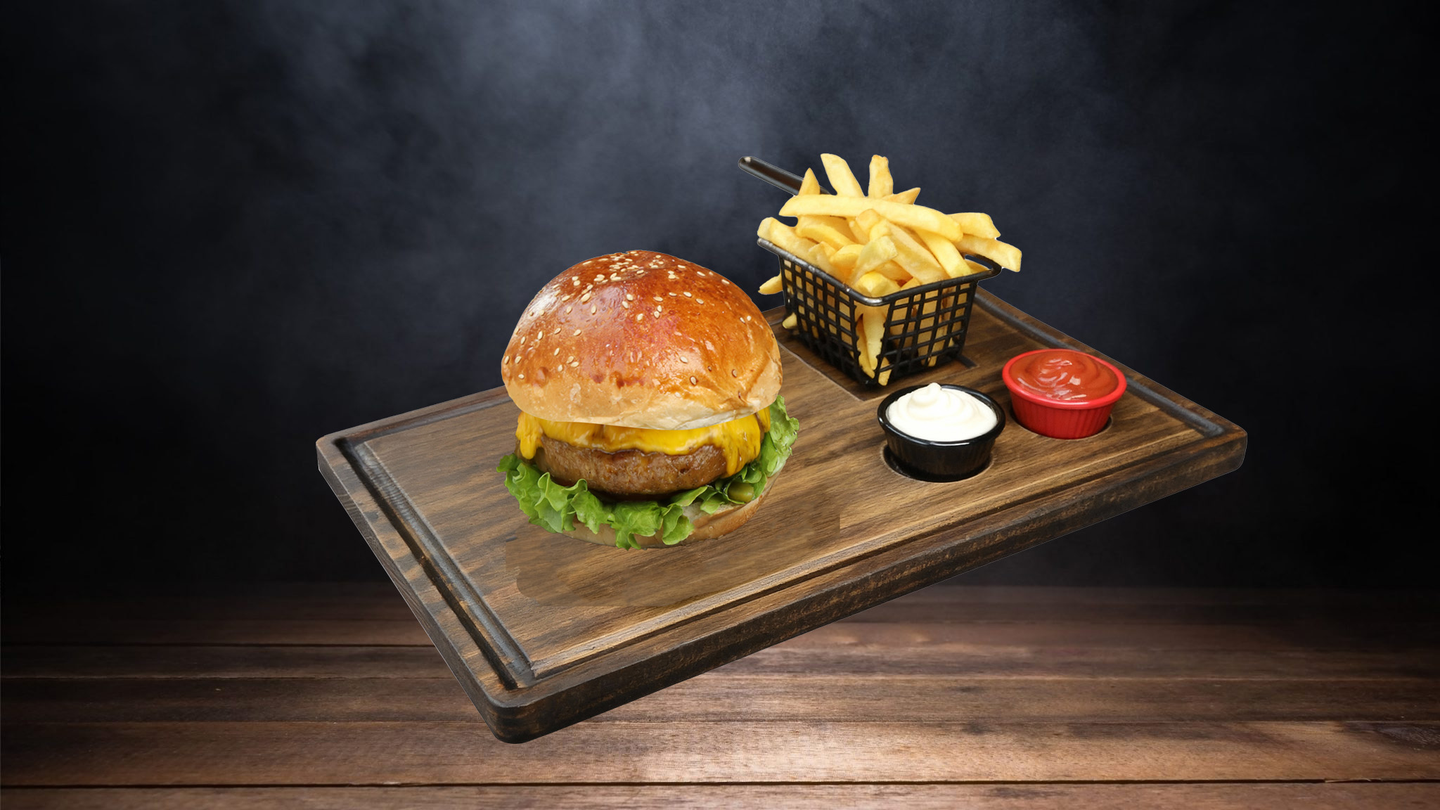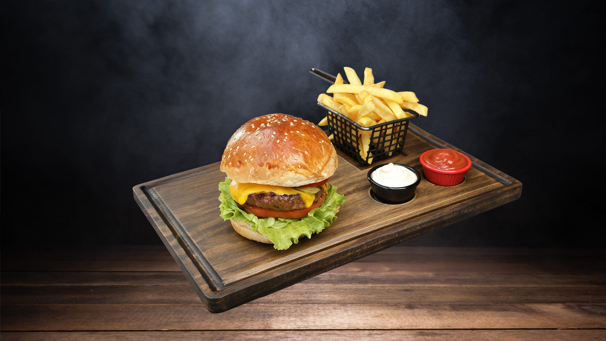Dana etinden hazırlanmış hamburger köftesi,patates kızartması.