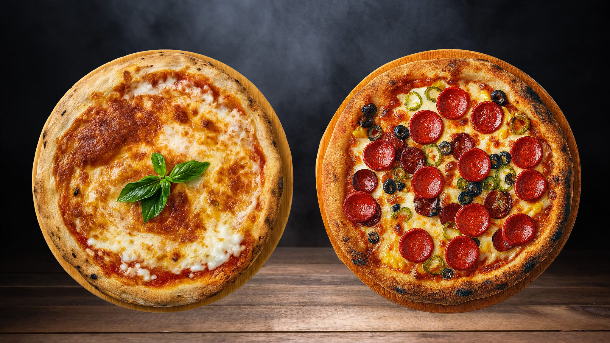Pizza çeşitleri.Karışık pizza, margarita pizza, kavurmalı pizza, tavuklu pizza.